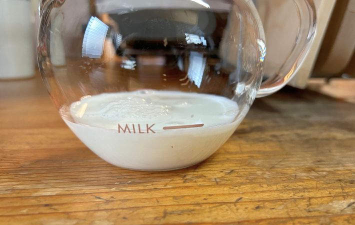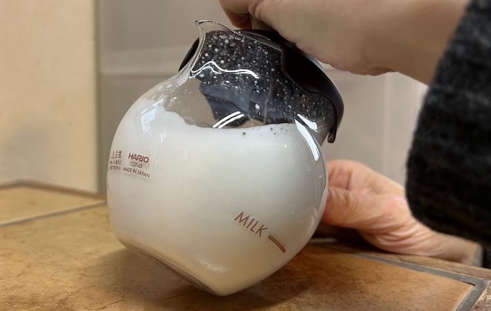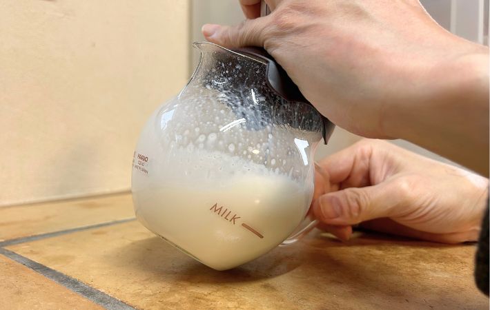 まずは、牛乳をガラスポットの『MILK』と記された100㎖の線まで入れてください。