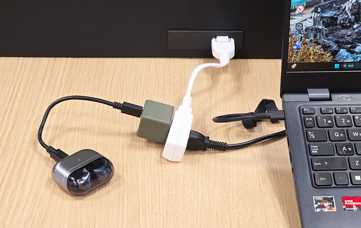 大型の電源タップのように差し込み口やケーブルが余らず、デスク上やコンセント周辺をスッキリさせたまま使えます。