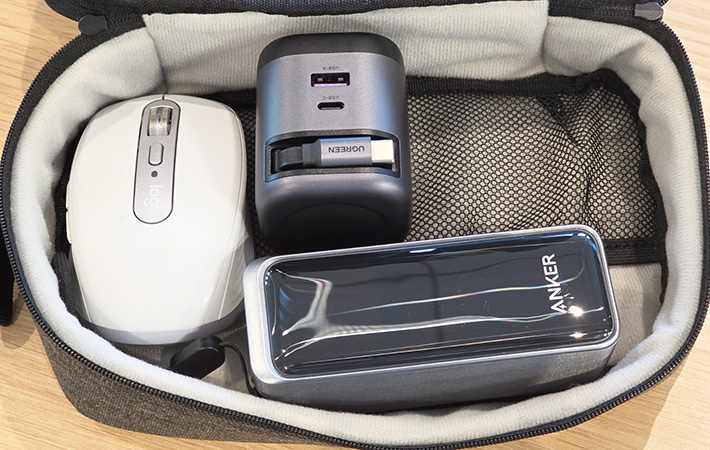 実際に筆者がよく持ち歩くガジェットを収納してみると、こんな感じです。
