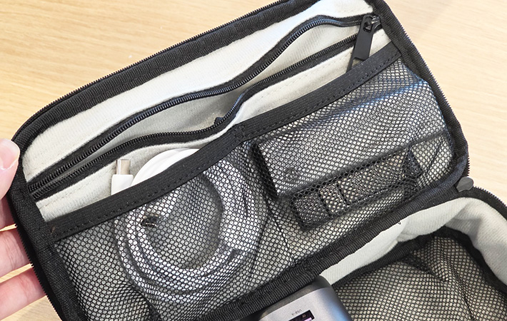 ポーチの中には複数のメッシュポケットとファスナーつきポケットを搭載。ケーブルやUSBハブのような小さいアイテムも、すっきり収納できますよ。