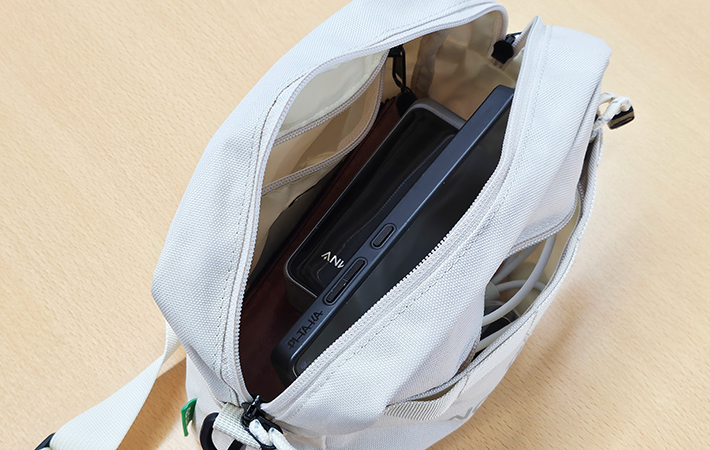 パッと見た印象よりもスペースが広々としていて、バッグの中はまだ十分余裕がありました。内部のファスナーポケットは、使ってすらいません。