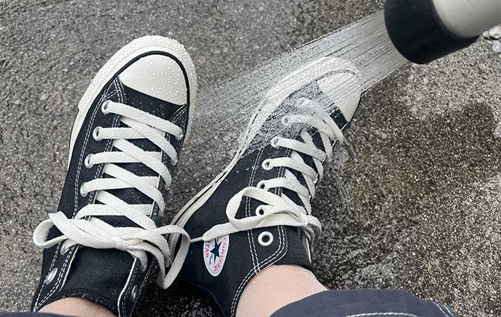 方法は、シンプルにゴアテックスモデルを履いた状態で大量の水をかけてみるだけ。