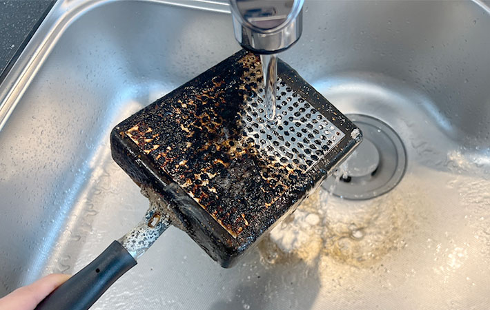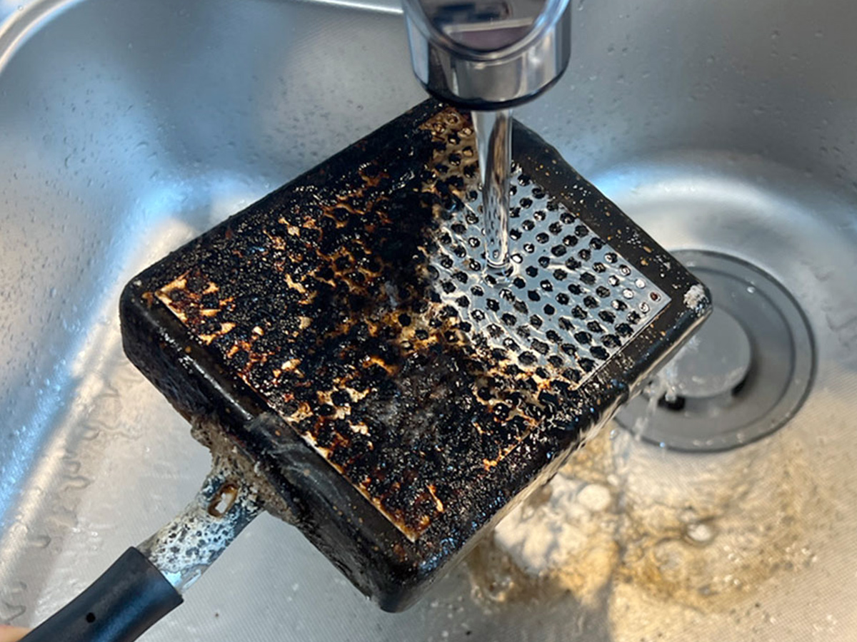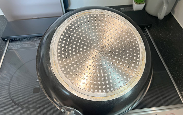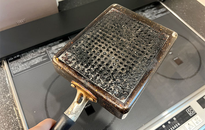 我が家の卵焼き専用フライパンの裏側には、黒焦げがびっしりとついてしまっています。