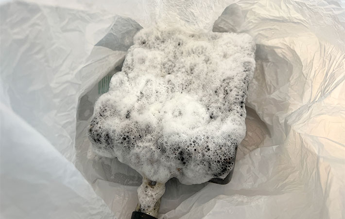 ビニール袋に入れた卵焼き用のフライパンにスプレーすると、モコモコ泡が焦げに密着していきます。