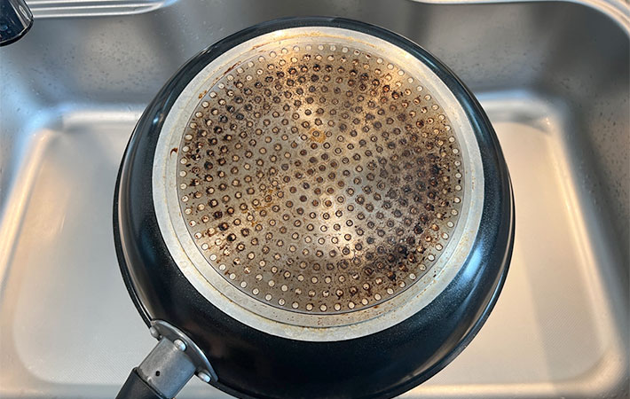 このままほうっておくと、熱伝導率が低下して調理時間が長くなってしまい、食材にうまく火を通すことができません!