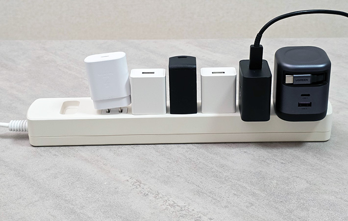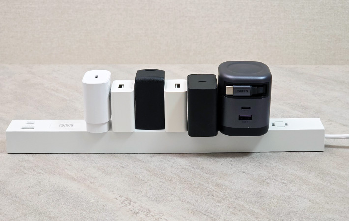 幅が広い充電器ばかりのせいで隣に干渉してしまい、差し込み口が1口使えなくなってしまいました。