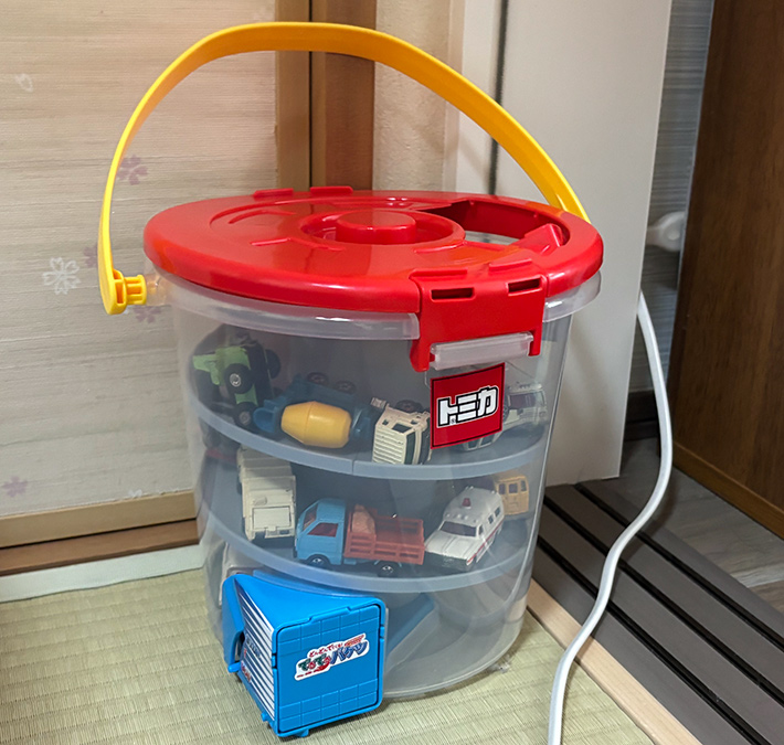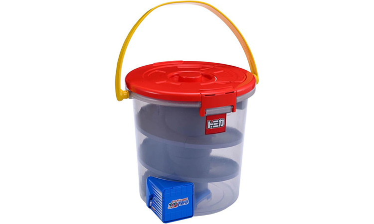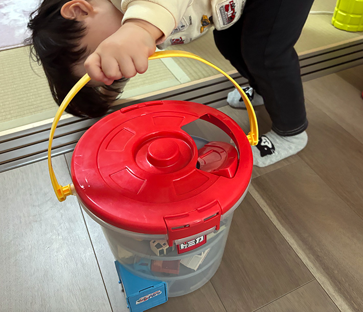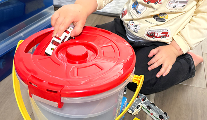 続いては、『トミカ』がぐるぐる回転しながら収納できる、『でるでるバケツ』。