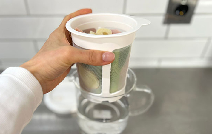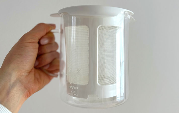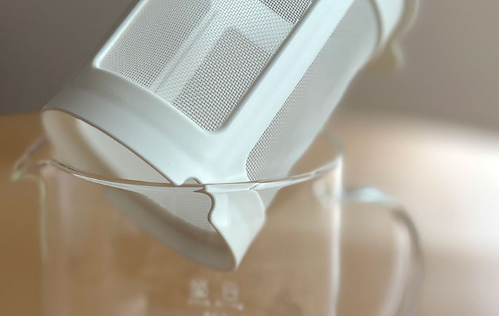 ポットの底まで届く大きめのストレーナーが、だしをしっかりと抽出。これを本体の縁に引っ掛けることで、最後の1滴まで抽出できる仕様になっています。