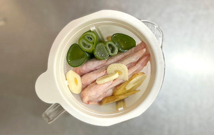 そしてストレーナーに鶏の手羽先・にんにく・しょうが・長ねぎの青い部分・赤唐辛子を投入。