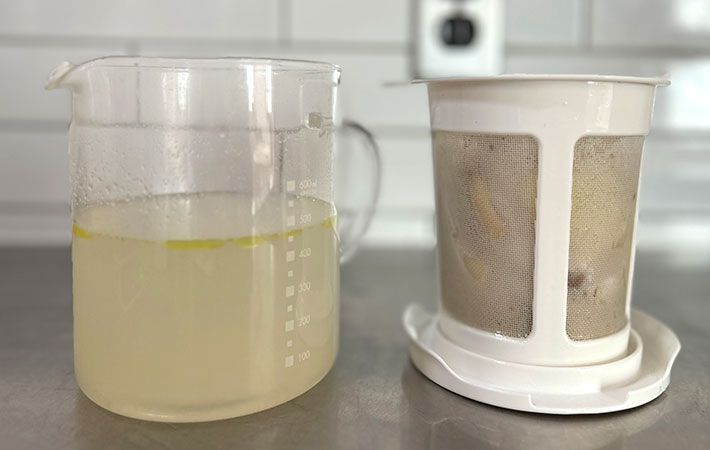 一度取り出して5分置き、再び電子レンジで4分加熱。あとはストレーナーを外すだけ。
