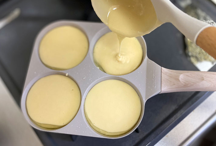 その点、『4つ穴フライパン』なら、大きさも深さも同じなので、ホットケーキミックスの量を調整しやすくなっています!