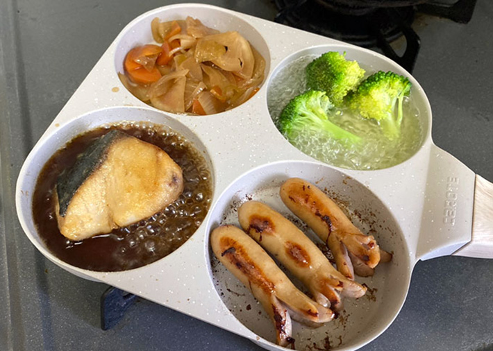 見た目の通り、4つの仕切りがあるフライパン。