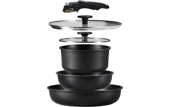 CAROTE カローテ フライパン 鍋 セット IH&ガス火対応 6点 PFOAなどの有害物質不使用 プロ仕様 5層構造 チタンコート 軽量 取っ手のとれる 洗練されデザイン コンパクト収納 1人暮らしセット 新生活セット 取っ手のとれる こびりつかずに お手入れ簡単 黒 ブラック