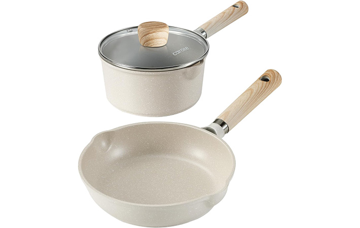 CAROTE カローテ フライパン セット 3点 16cm鍋+20cmフライパン 鍋セット IH&ガス火対応 PFOAなどの有害物質不使用 5層構造 マーブルコート 軽量 1人暮らしセット おしゃれ こびりつかずに お手入れ簡単 Cosyシリーズ 1年保証 グレージュ