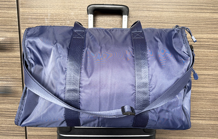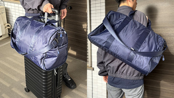 また、スーツケースのハンドルに掛けたり、背中側にヒョイッと掛けたりと、持ち運び方が選べるのもポイントでしょう!