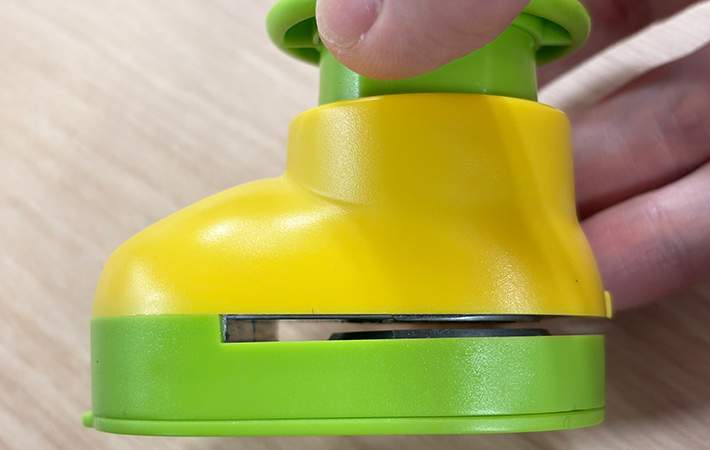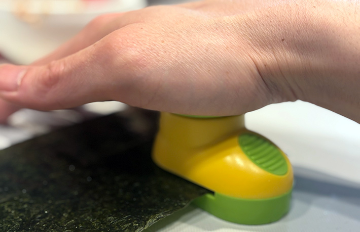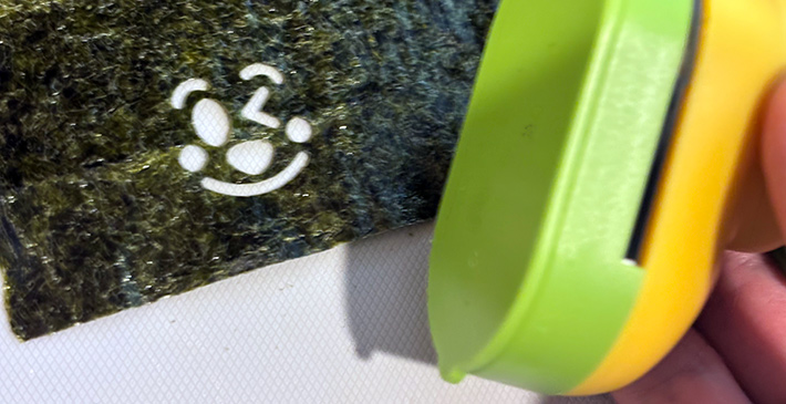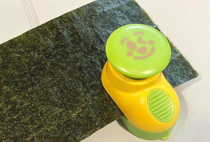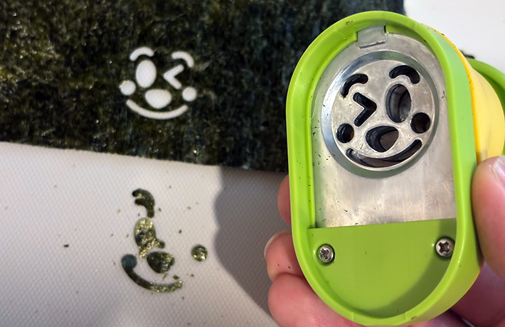 すき間には、目や鼻、口などの笑顔パーツの刃が隠されているので、上からギュッと押すと、ザクッと焼きのりが抜かれる音がします。
