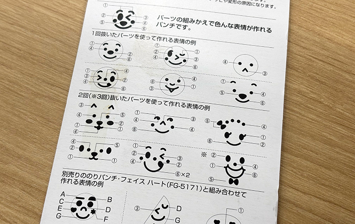 『のりパンチ』のパッケージには、1回~3回抜いたパーツを組み合わせてできる笑顔のガイドがあるので参考にしてくださいね。