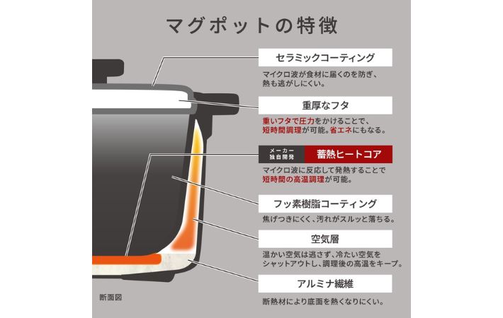 電子レンジに入れて温めると、本体内部の特殊発熱体(蓄熱ヒートコア)が加熱され、その熱が食材に伝わり、短時間での高温調理ができる仕組みです。
