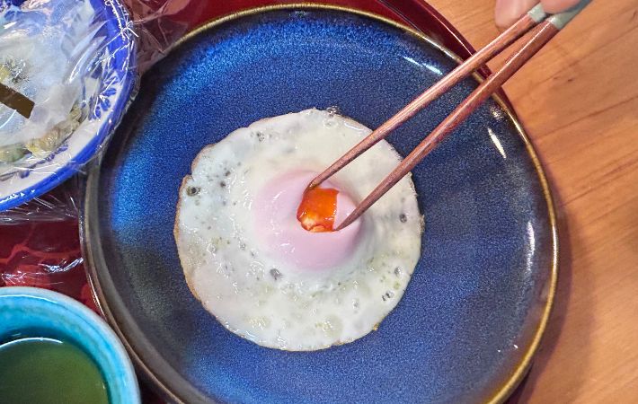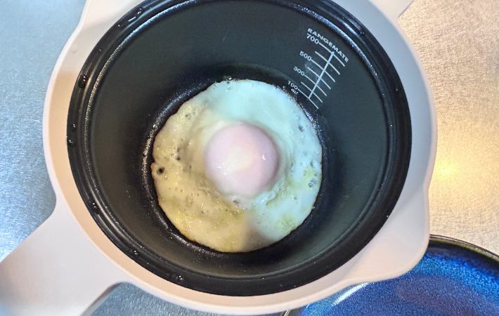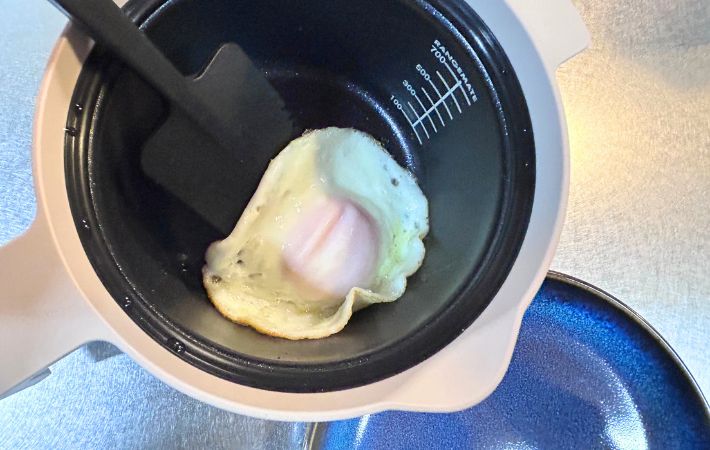 釜のフッ素樹脂コーティングのおかげもあり、目玉焼きはスルッと外れて皿への移動もスムーズにできましたよ。