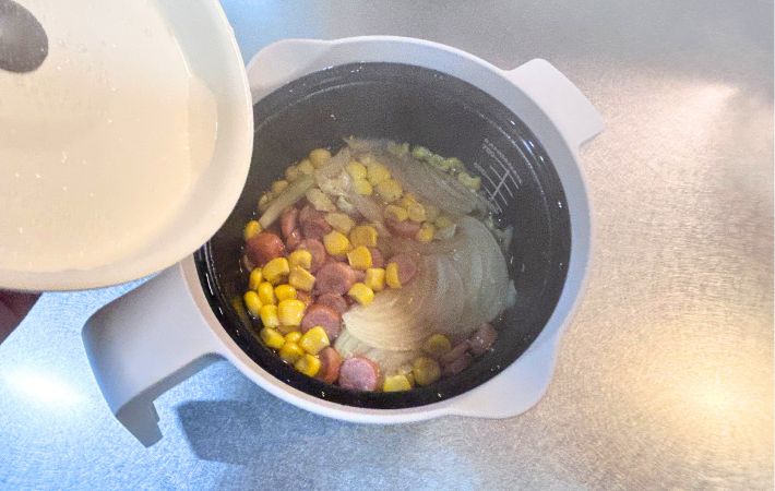 材料を食べやすい大きさにカットしたら、調味料、水と一緒にまとめて『マグポット』に入れてOK。