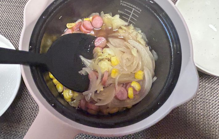 玉ねぎやキャベツはしっかり火が通り、ウインナーもぷりっとした仕上がり。電子レンジ調理とは思えないほど、具材全体が均一に温まっていました!