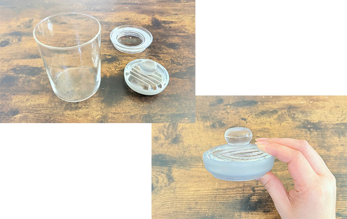 耐熱ガラス製の本体、樹脂製の蓋、ガラス製の重石の3つがセットになっており、重石にはガラス同士が当たらないように、シリコーンゴムがついています。