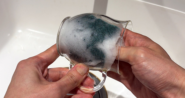 耐熱ガラスの透明感と丸っこい形が特徴の『香りマグカップ』。