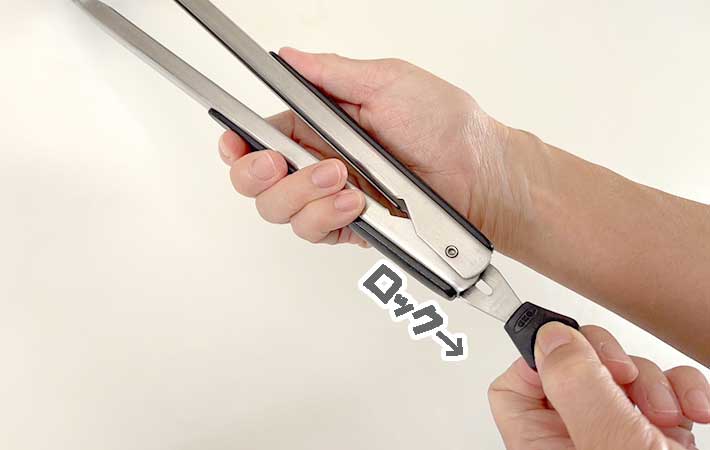 まず便利なのがロック機能。持ち手のフック部分を引っ張ると先端が閉じた状態で固定され、収納時にかさばりません。