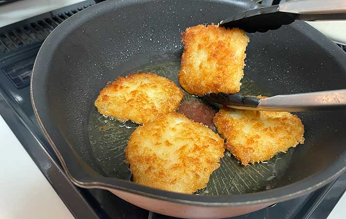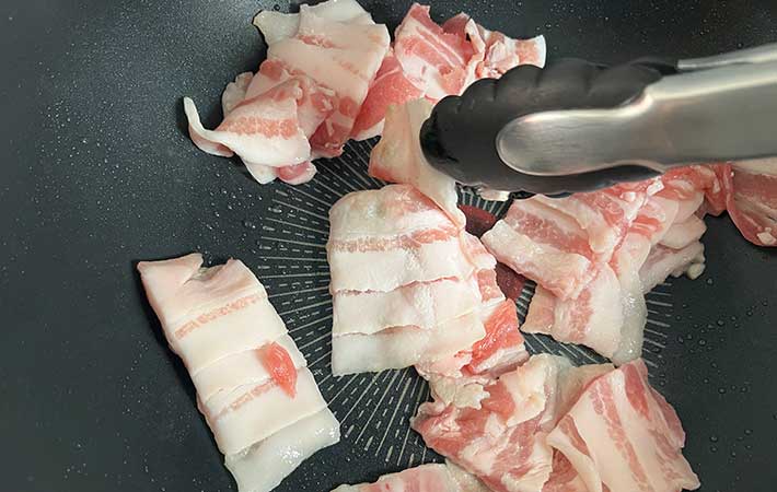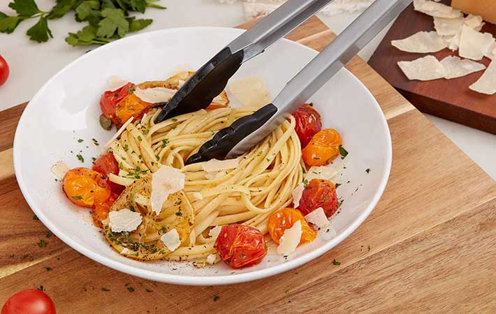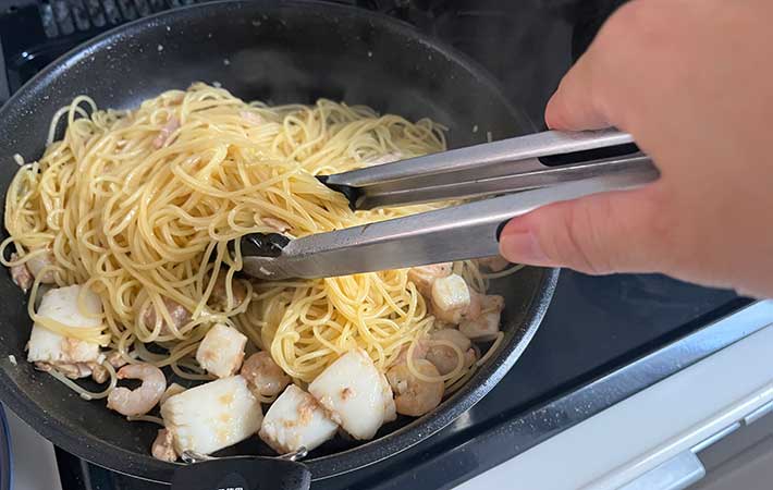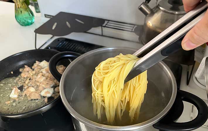 通常はザルで湯切りするところを、このトングなら鍋からつかんでそのままフライパンへ移せます。