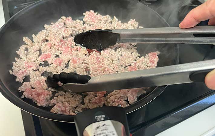 シリコンスプーンを2本使っているような感覚で扱えるため、細かく均一にほぐせます。無駄な力を入れずに調理できるので、手の疲れもほとんど感じません。