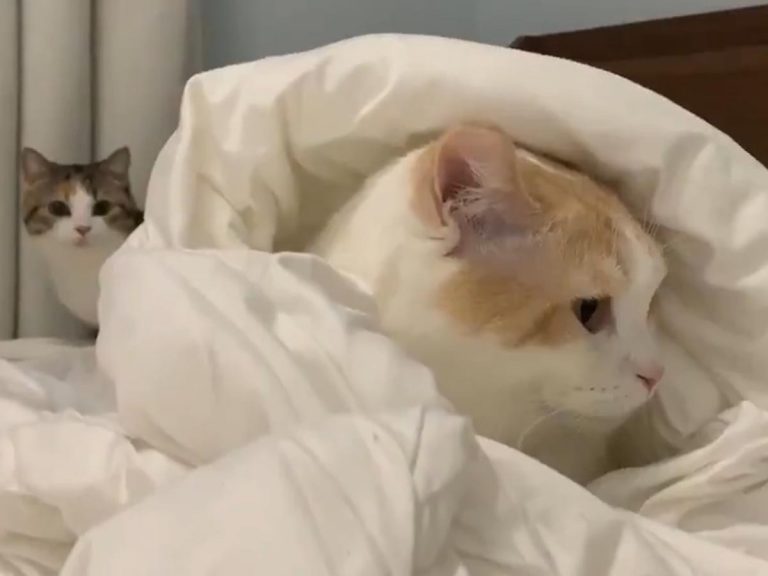 うつ伏せに寝ている彼女のプリッとしたお尻にレーザーポインタを照射したら、猫はどんな反応をするのか?