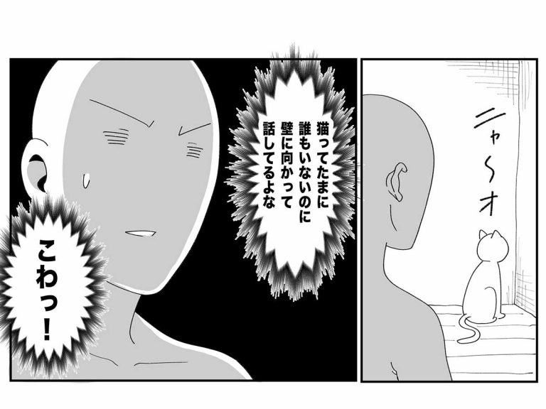 何もない壁に向かって鳴く猫に、飼い主「こわっ」 2コマ目がジワる