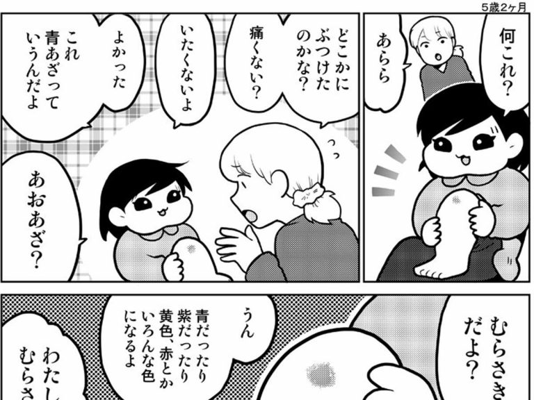 5歳の娘さんを育てている、きくまき(@kikumaki00)さん。 ある日、娘さんの足に、青あざを発見しました。 初めて目にした青あざに、娘さんは興味津々で…。 『青あざ』 青あざ #育児漫画 #娘が可愛すぎるんじゃ p…