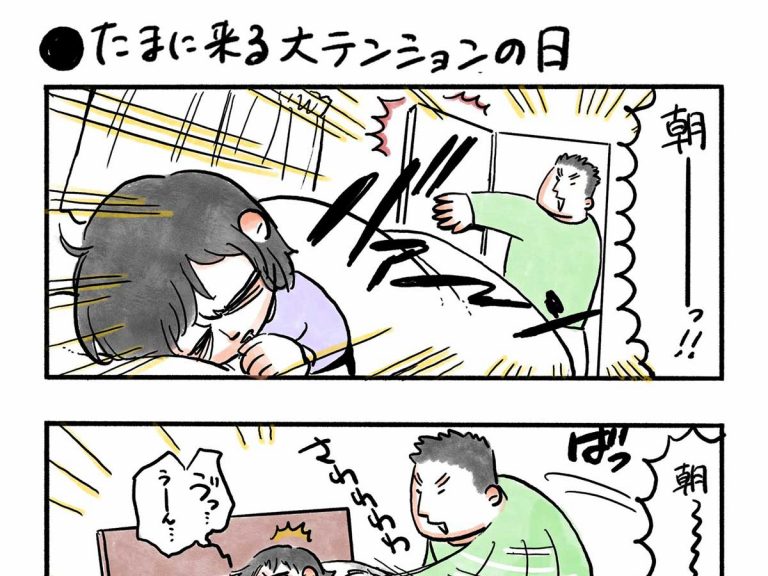 漫画家の木崎アオコ(@aokororism)さんは、夫との愉快な出来事を描き、Twitterに投稿。 仲のいい夫婦のやり取りに癒される人が多く、人気を博しています。 『たまに来る大テンションの日』 木崎さんの夫は、まれに…