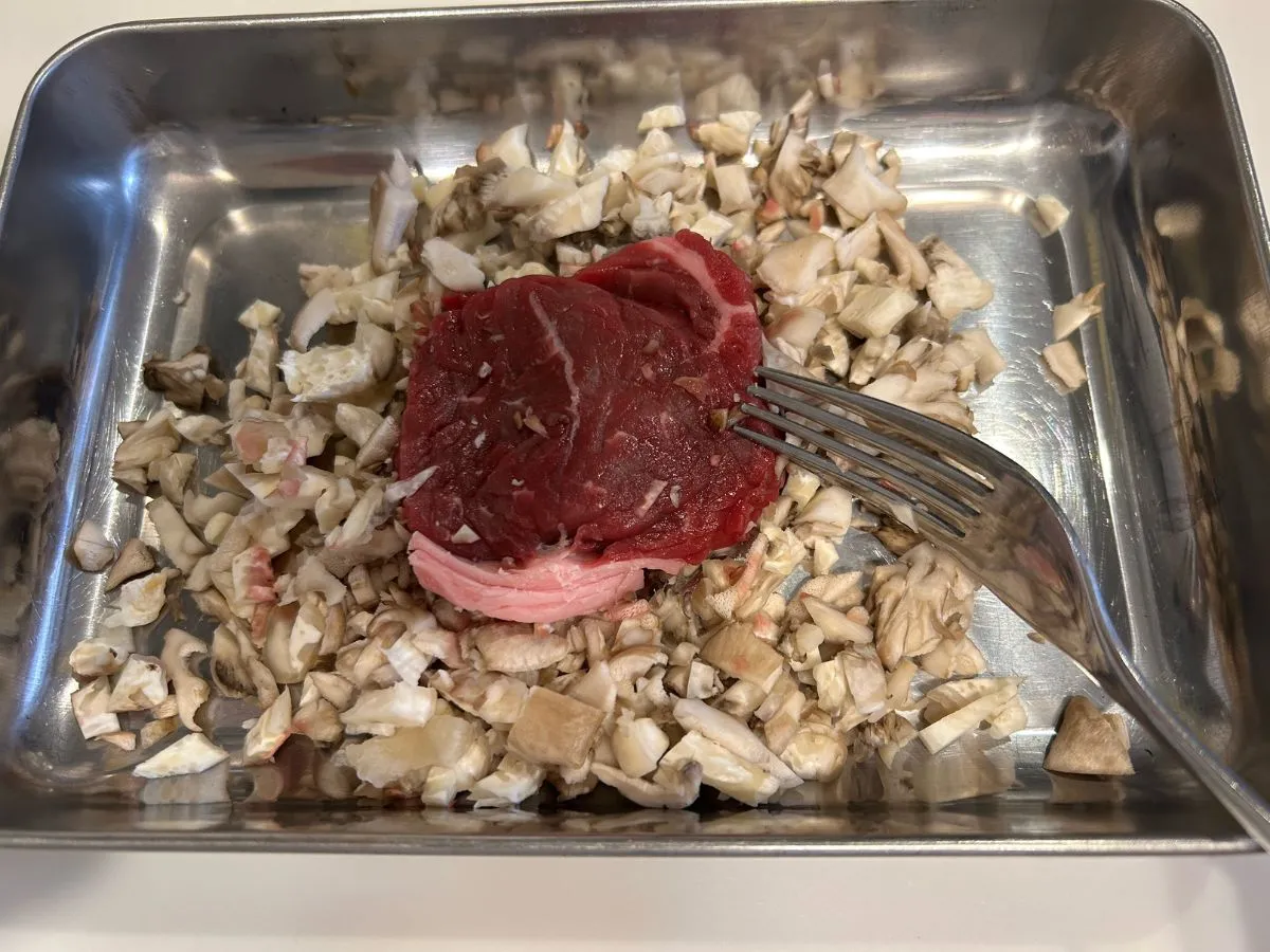 「キノコと一緒に置くだけで変わるわけがない」という疑いを持ちつつ、1枚のステーキ肉を真っ二つに切り、片方だけをマイタケまみれにしてみました。