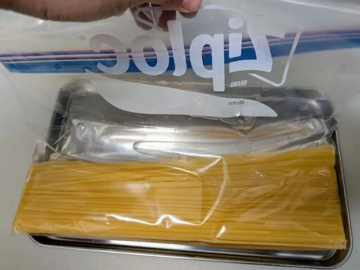 乾燥パスタを保存袋に入れ、全体が浸かる程度まで水を注ぎます。保存袋がない場合は、保存容器で代用しても問題ありません。