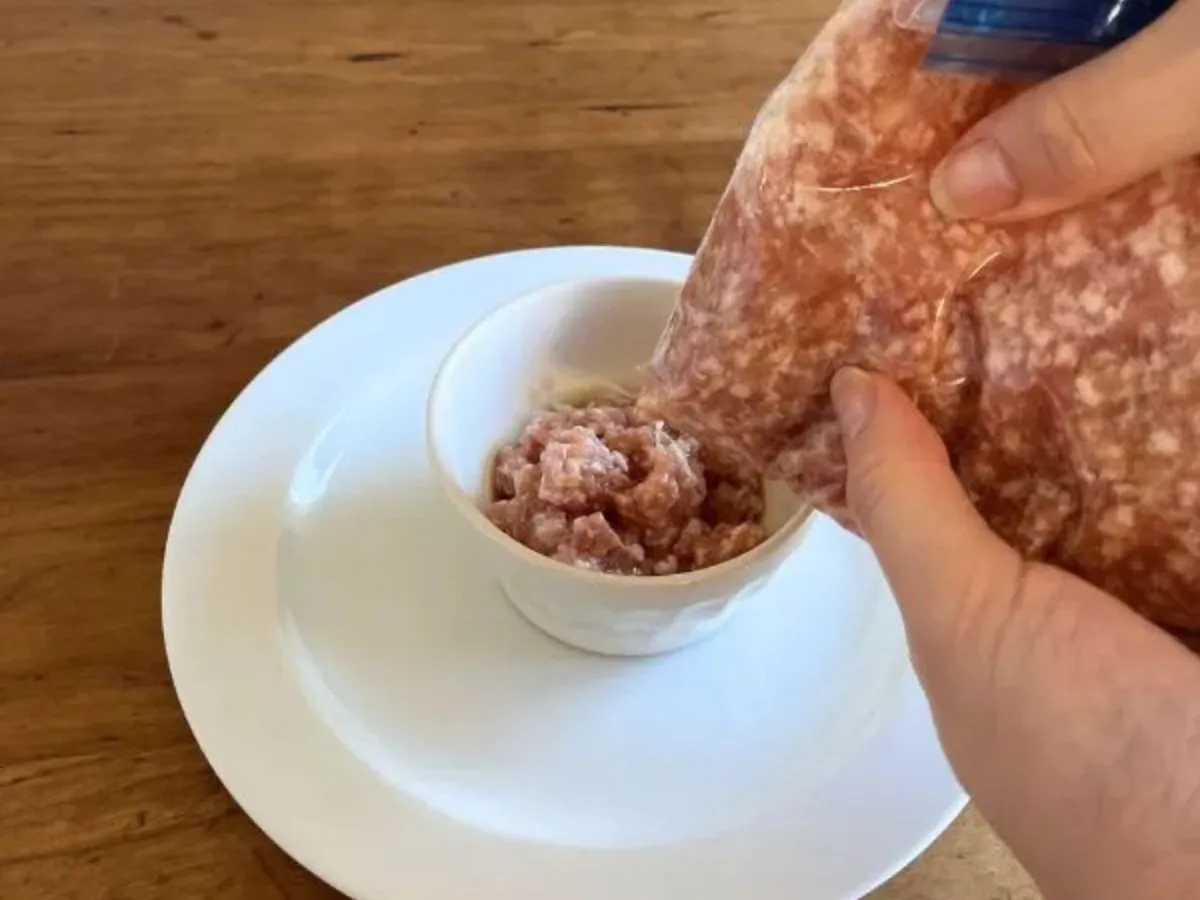 保存用袋の端をはさみで切り、肉だねを小鉢に絞り入れましょう。