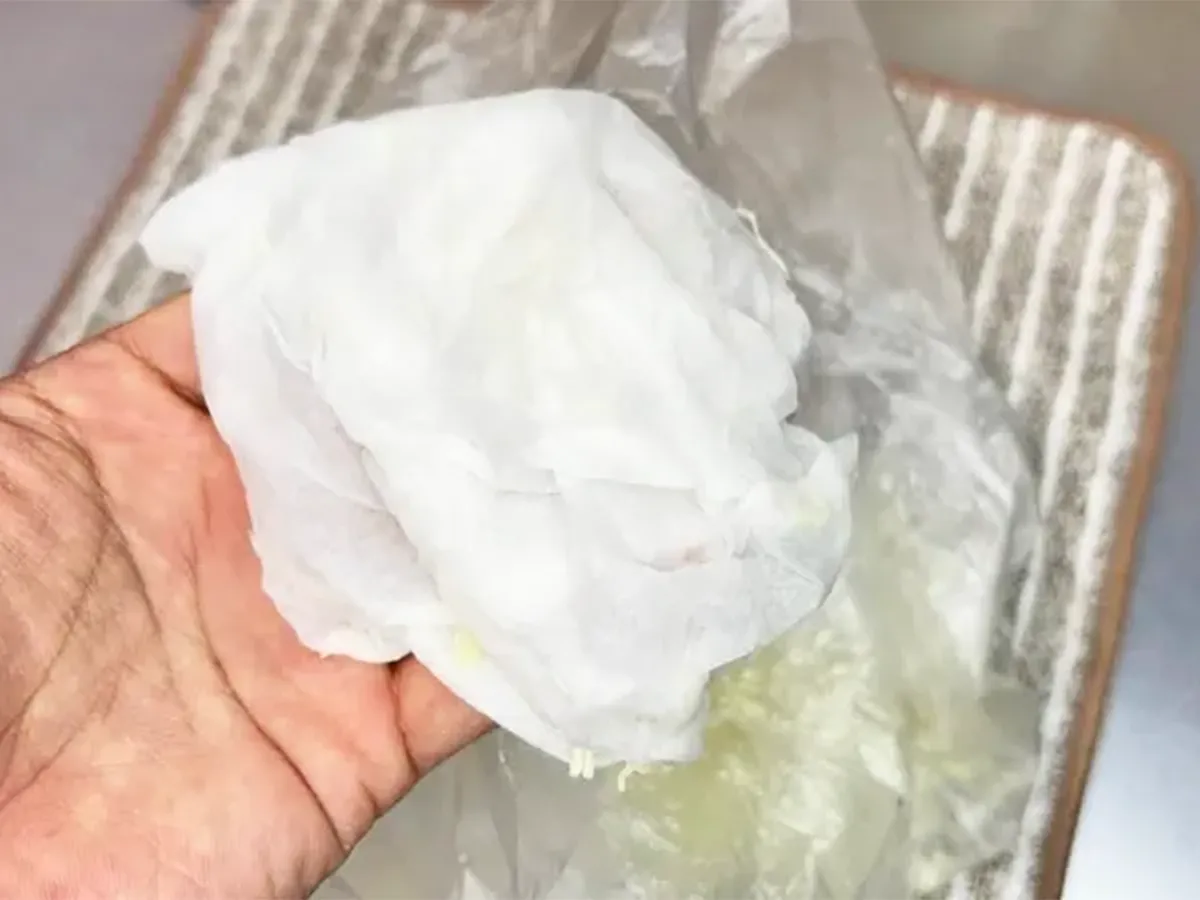 振り終わったら、袋の中を確認してみます。すると、キッチンペーパーがしっかりと水分を吸収していました!