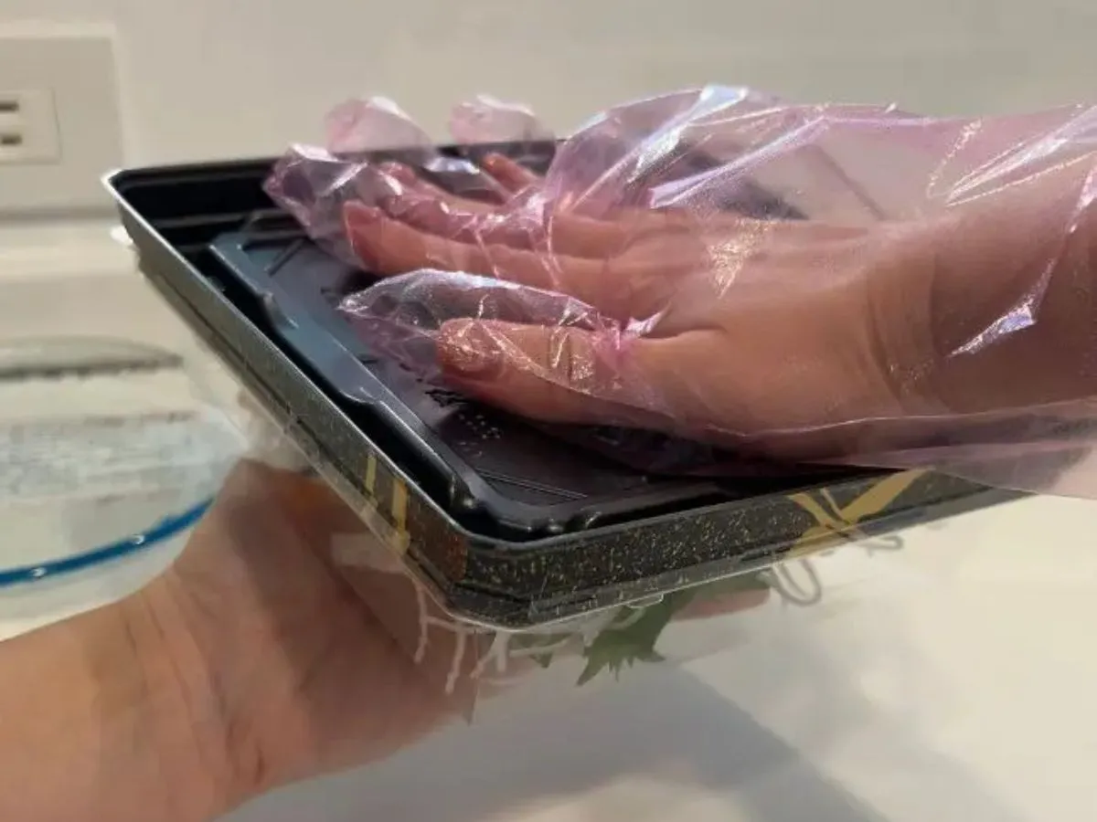 そこで活躍するのが、パックの蓋です。まず、刺身に蓋をかぶせて、そのままクルッと裏返しましょう。