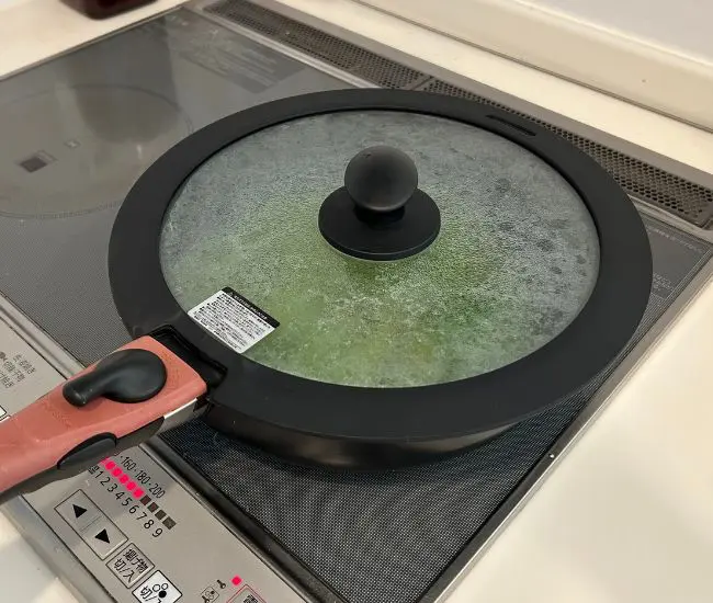 加熱後は蓋を取り、軽くフライパンを揺らして余分な水分を飛ばしましょう。