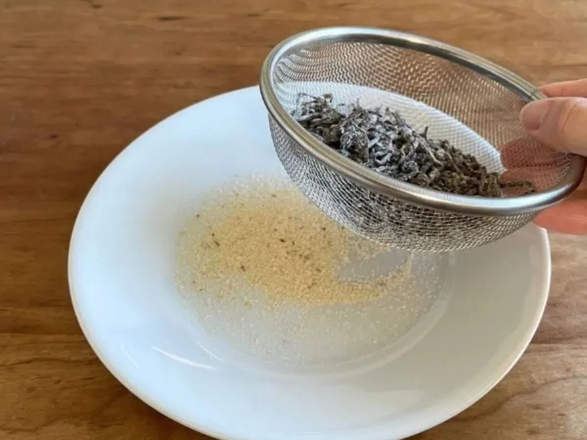 塩昆布をザルに入れて振ると、昆布と塩に分けられます。