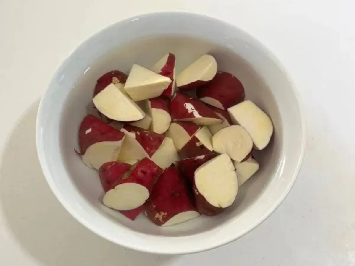 サツマイモはよく洗い、皮つきのままひと口大の乱切りにします。