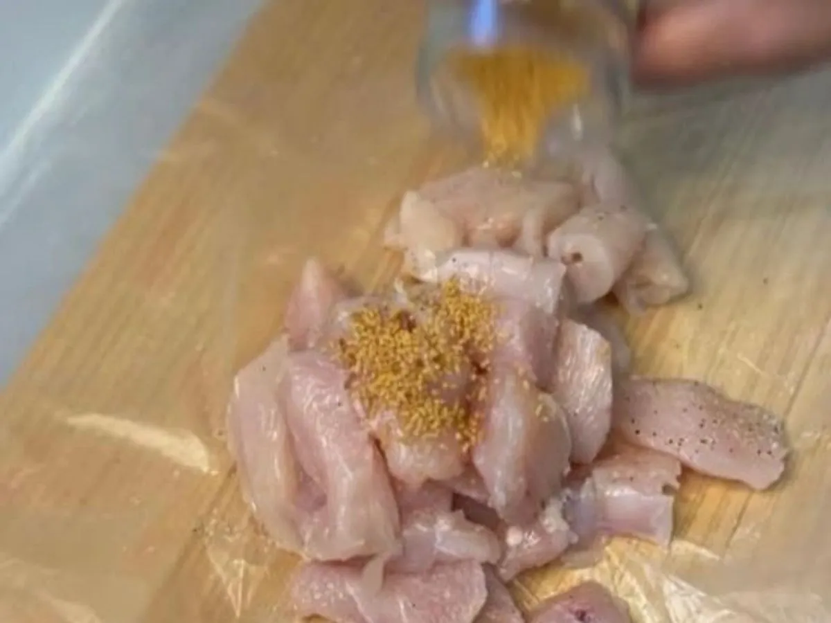 鶏むね肉に、塩コショウとコンソメを振りかけ、揉み込んで味をなじませましょう。