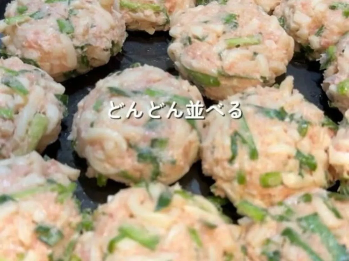 まおごはんさんが紹介するのは、餃子の具材にプラスして刻んだうどんを入れて焼くレシピです。1個ずつ包む必要がなく、時短につながります。