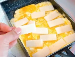 玉子焼き器に卵液を流します。その上に餅をできるだけ重ならないように、のせていきましょう。