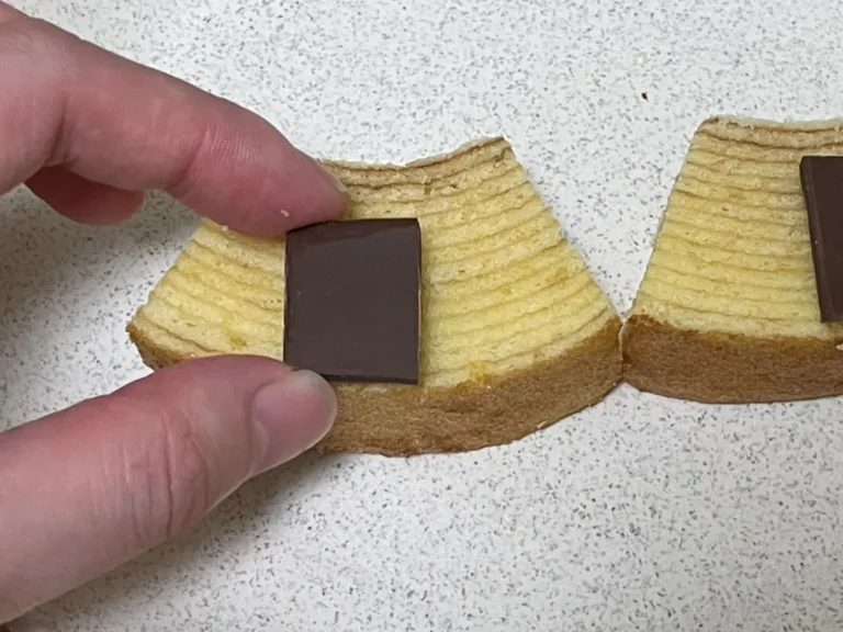 バームクーヘンは横倒しにして、四角形に割った板チョコを中央下に置きます。