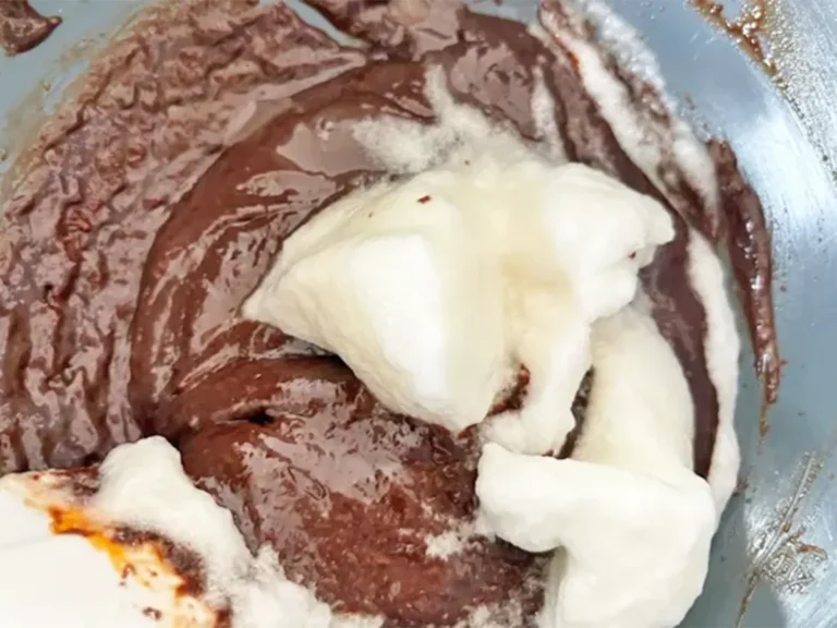 泡立て器を使って固い生地をほぐすようにざっと混ぜ、生地がやわらかくなってきたらゴムべらに替えてメレンゲがなくなるまでよく混ぜましょう。