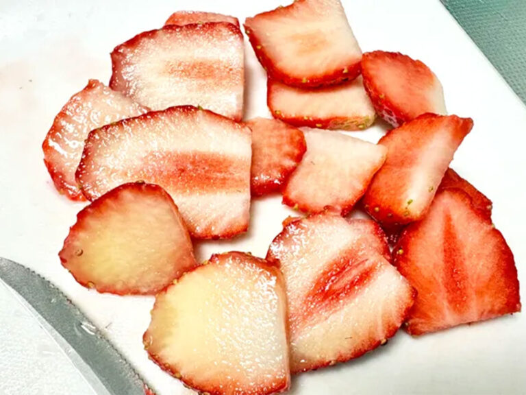 1.イチゴを洗い、ヘタを取ったら薄切りにする