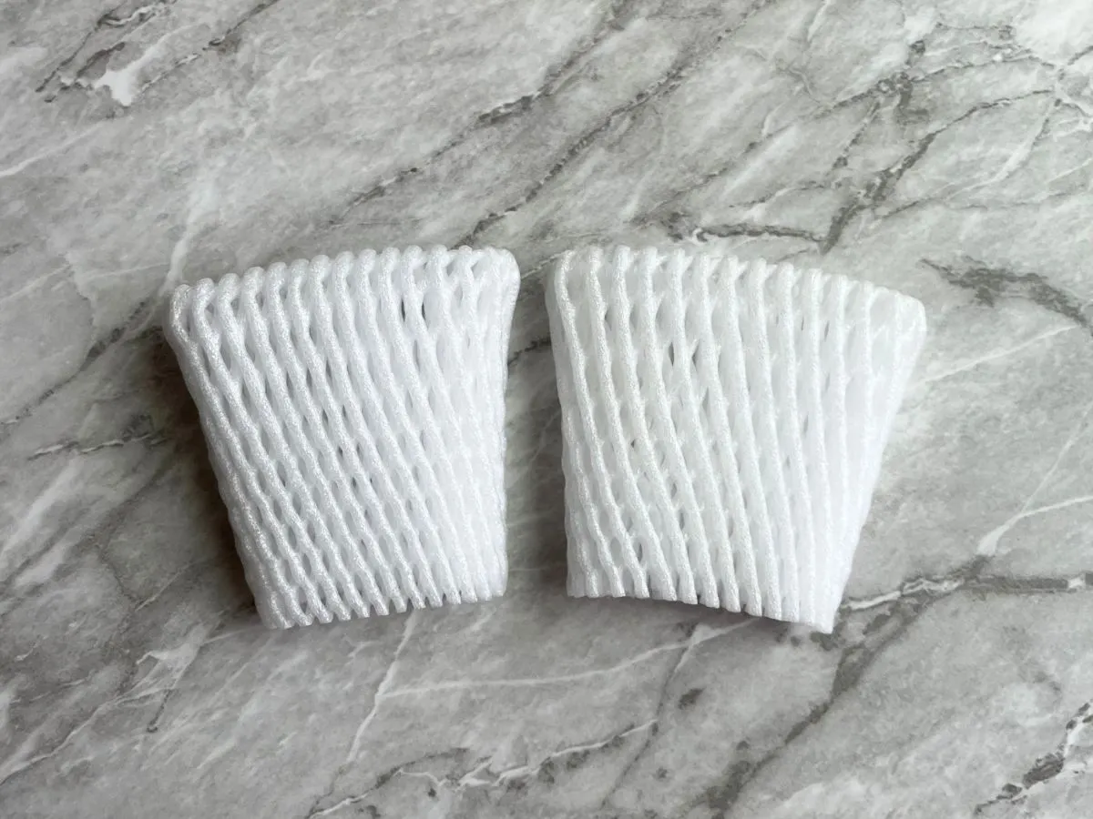 フルーツキャップは、ポリエチレン製の緩衝材です。配送時の衝撃から果物を守るため、やわらかくクッション性のある網目状の作りになっています。