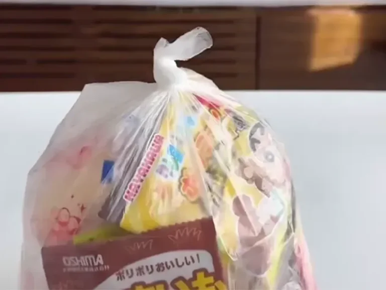 ゆるりさんは、お菓子がたくさん詰まったビニール袋を、紐1本を使って結ぶといいます。